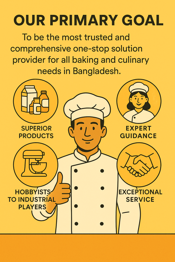 Our primary goal is to be the most trusted and comprehensive one-stop solution provider for all baking and culinary needs in Bangladesh. We aim to empower our customers, from hobbyists to industrial players, by providing superior products, expert guidance, and exceptional service, ultimately contributing to their success and the growth of the culinary industry.